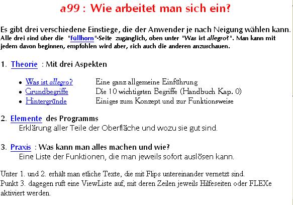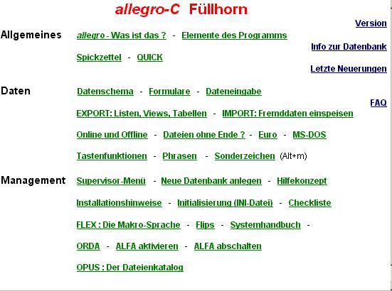 Aber die größte und bedeutendste Neuerung fällt nicht sofort ins Auge: das FLEX-System. FLEX ist eine eigens für allegro entwickelte Makrosprache. Das bedeutet: es können immer neue Funktionen programmiert werden, und zwar auch vom Anwender für seine eigenen Zwecke, ohne dass das Programm erweitert werden muss. Neue Funktionen können dann auf selbstgestalteten Menüs erscheinen, wie das Füllhorn oder anders gestaltet, und wie bei einem Browser braucht man nur noch zu klicken, um die Vorgänge auszulösen. Dadurch ist das CockPit des DOS-Systems völlig abgelöst worden! Eine übergeordnete Plattform, wie eben das CockPit, ist nicht mehr nötig, alles kann vom Hauptprogramm a99 aus aufgerufen und ausgelöst werden. Und die Entwicklungsabteilung muss nicht fortlaufend neue Menüpunkte und Buttons erfinden, sondern es werden Menüdateien (RTF-Texte) und FLEXe geschrieben. Das geht z.B. bis hin zu den Funktionen der Datensicherung, Indexerneuerung und Listenproduktion, ja sogar Erwerbung und Ausleihe, die nicht mehr als zusätzliche Programme für Windows neu geschrieben werden müssen.