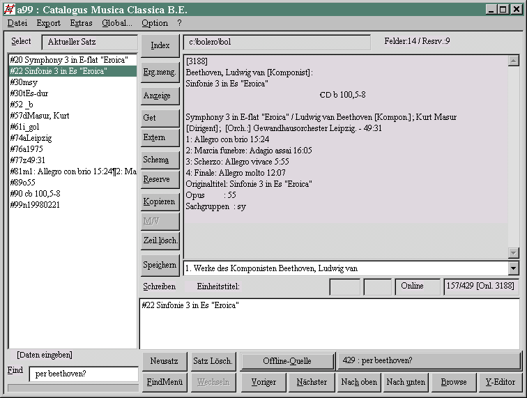 Hier ist eine "bolero"-Musikdatenbank in Benutzung. Es wurde eine Ergebnismenge mit dem Befehl "per beethoven?" gebildet, diese hat 429 Sätze, und es wurde darin der Satz 157 ausgewählt, Kategorie #22 ist im Schreibfeld. Außerdem ist zu erkennen: der Satz hat die interne Nummer 3188 und besitzt 14 Kategorien, im Hintergrundspeicher sind 9 Kategorien ("Reserve"), die Datenbank heißt "bol" und liegt auf c:\bolero. Die Statusanzeige "Online" besagt, daß gerade der aktuelle Online-Zustand des Satzes zu sehen ist. Sobald man die erste Änderung macht, erscheint links daneben "EDT".